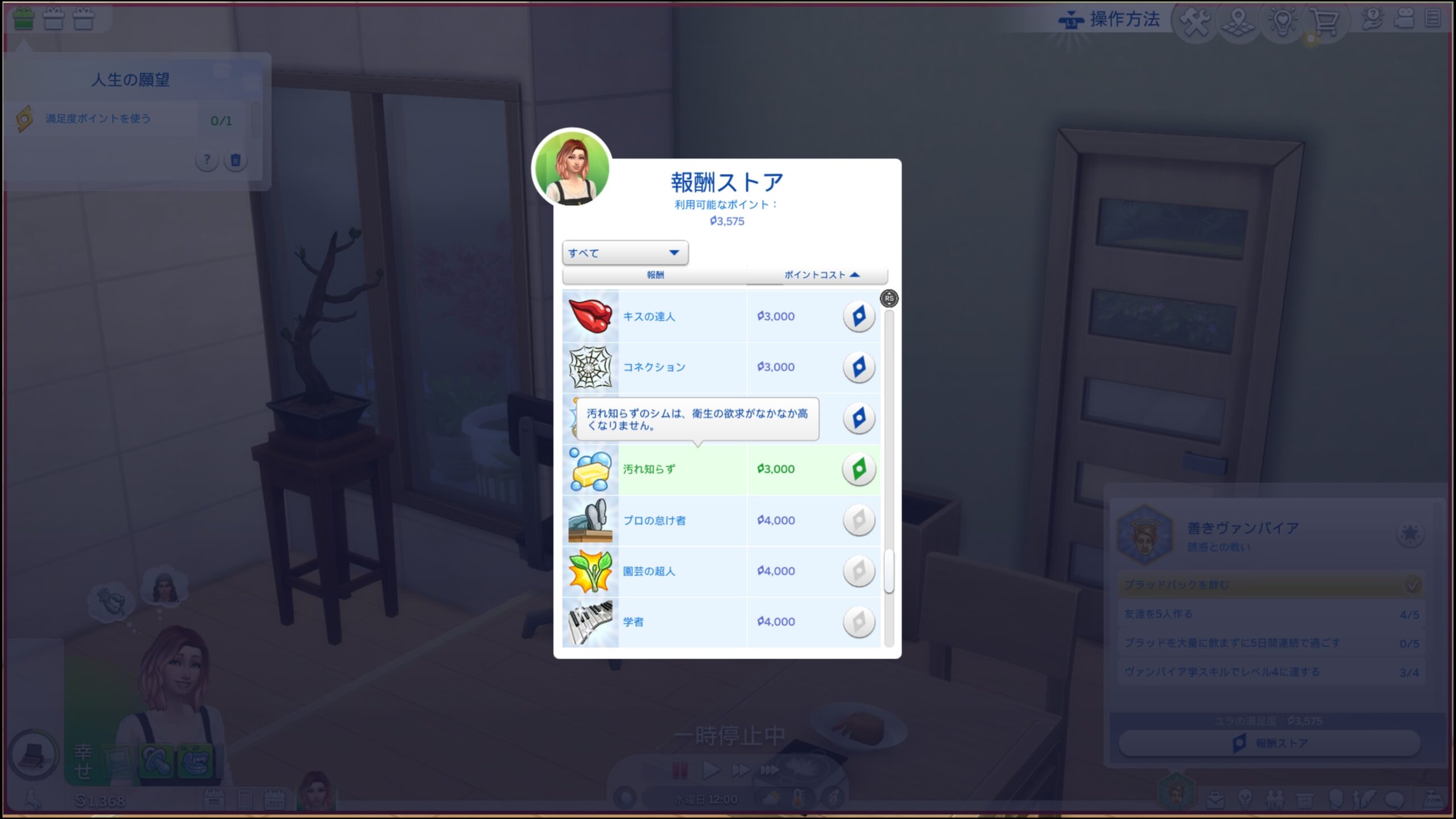 帰宅後たまった満足ポイントで汚れ知らずを取得